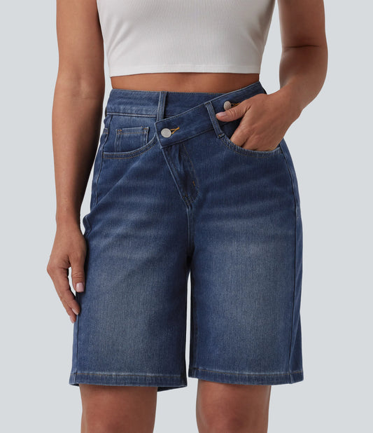 Lounge Flexâ„¢ Asymmetric High Waisted Washed Denim Casual Shorts 9'' with Pockets